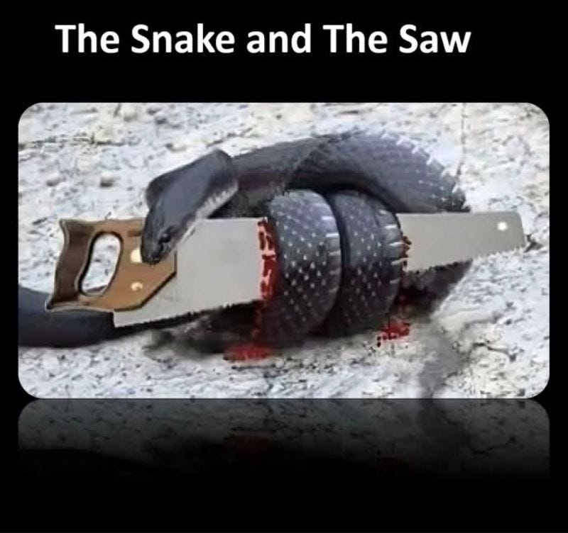 Out of anger and pride, it believes the saw is its enemy. The more it squeezes, the tighter the grip, the deeper the blade cuts into its own body. The saw never moved. The saw never fought. The snake, blinded by rage and ignorance, destroys itself.